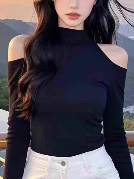 [月亮]:春秋纯欲性感立领露肩德绒上衣
