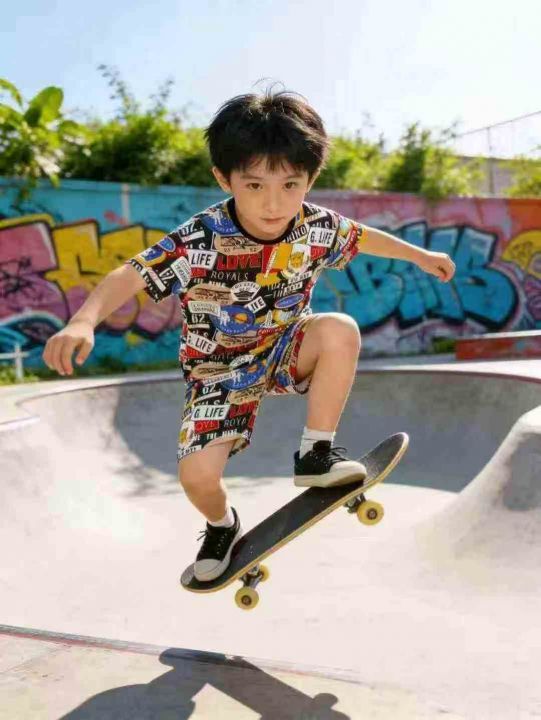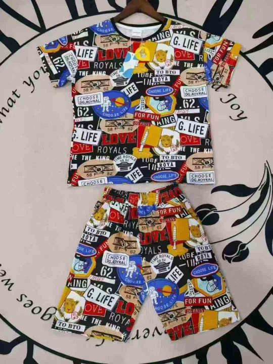 210套品牌中大童夏季纯棉满印花短袖T恤短裤套装,尺码110-170,整款单色,独立包装带吊牌