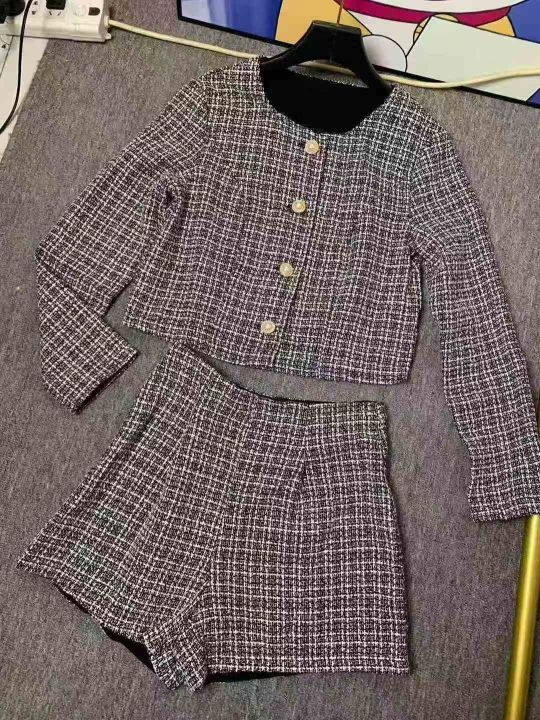22.8清170套女装小香风外套短裤 两件套 复古圆领长袖格纹小香风粗花呢外套高腰短裤套装 码数XS- L 独立拉链包装