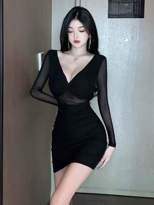 纯欲风性感V领连衣裙女秋冬季甜辣妹设计感内搭网纱修身包臀短裙,单款单色...
