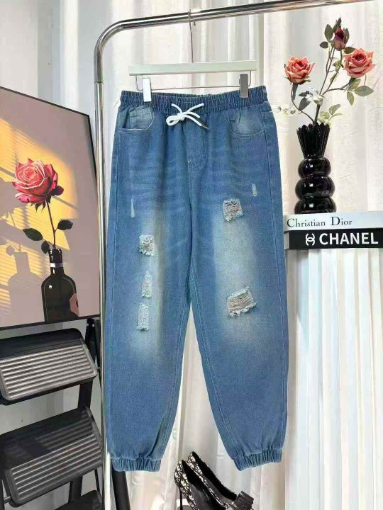 春秋季男士弹力小脚潮流破洞宽松长裤抽绳设计松紧腰牛仔裤