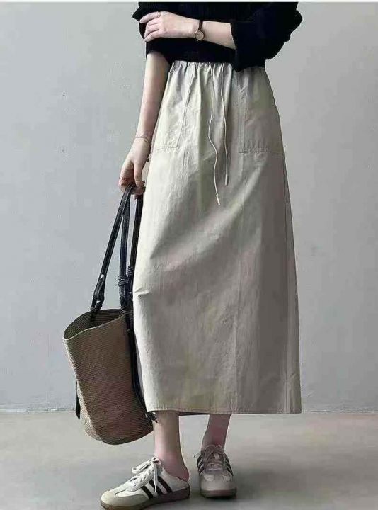 韩系新款复古高腰双口袋工装半身裙绑带松紧宽松A字裙休闲半身裙,高品质尼龙锦纶面料,独立包装