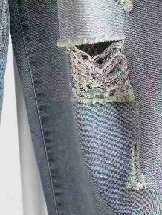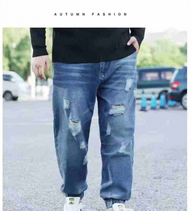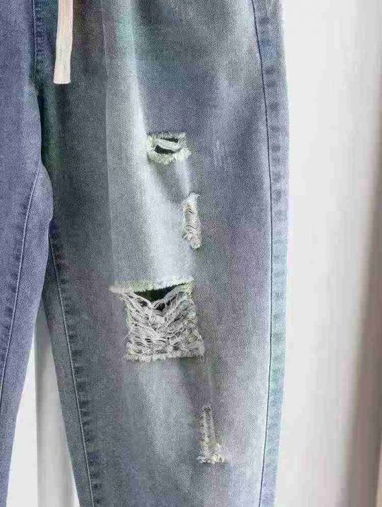 春秋季男士弹力小脚潮流破洞宽松长裤抽绳设计松紧腰牛仔裤