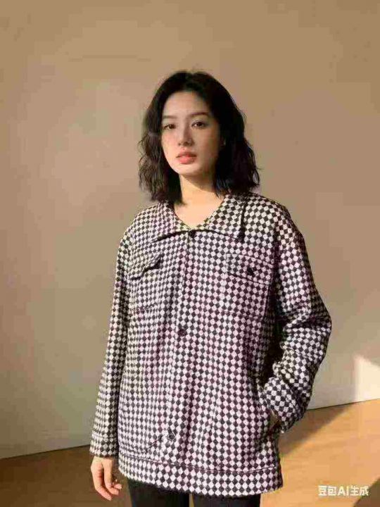 贝吉棋春秋款外套女ins美式复古棋盘格子polo领外套,...