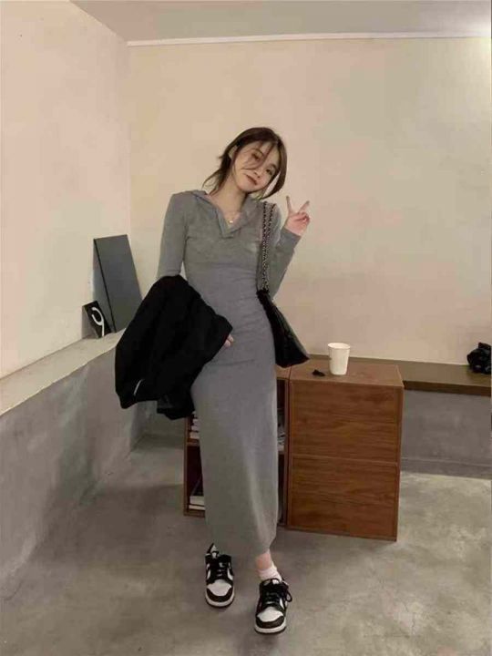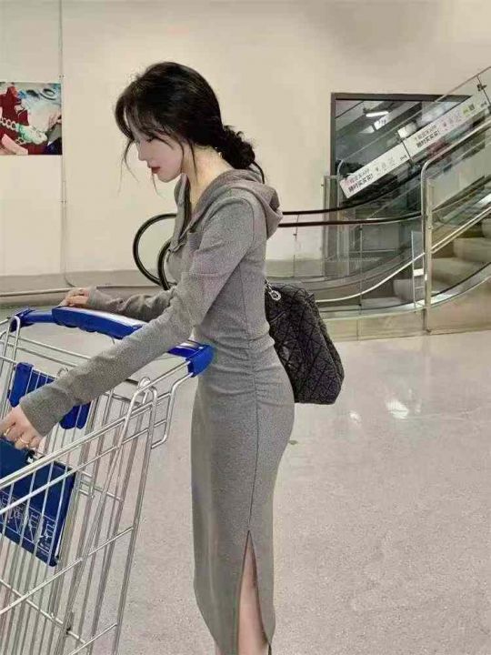 [月亮]:辣妹修身包臀开衩连帽卫衣长裙连衣裙