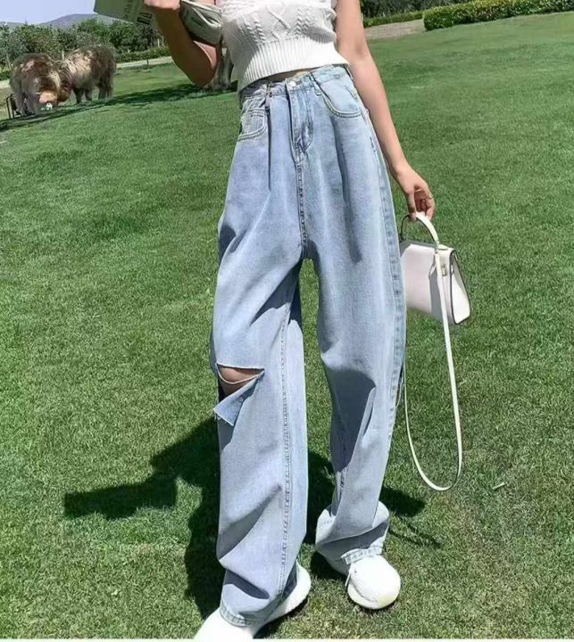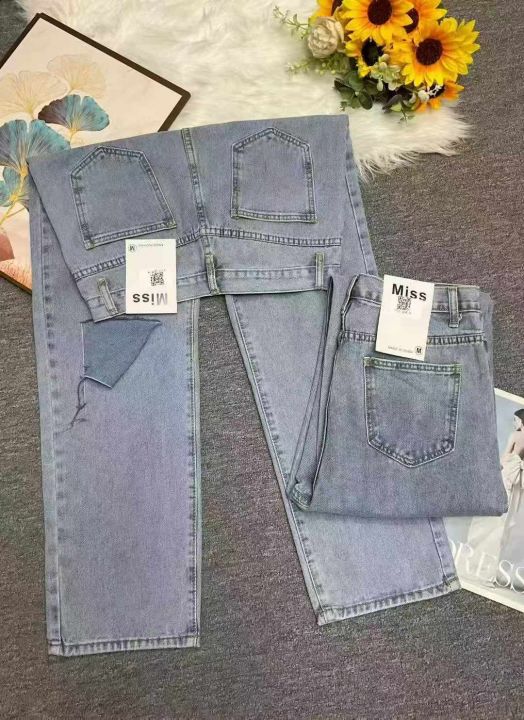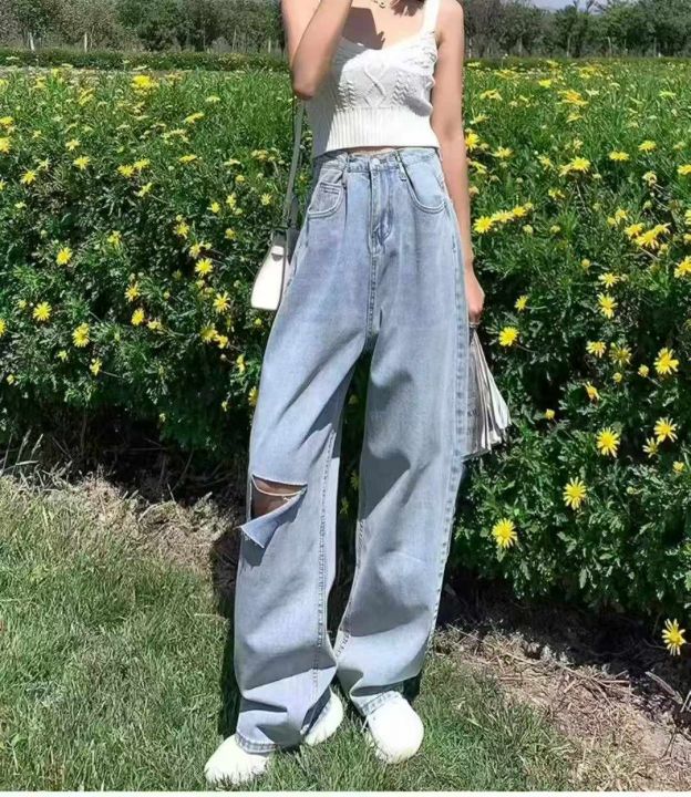 春秋新款复古网红破洞可调节直筒阔腿牛仔裤,独立包装...