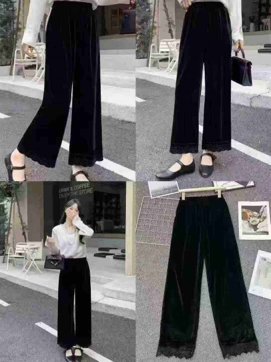 ☕️黑色金丝绒阔腿裤女秋冬加绒加厚直筒裤慵懒高腰显瘦休闲裤,带蕾丝裤脚...