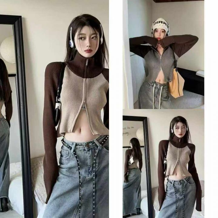春季新款撞色插肩双头拉链辣妹设计感弹力修身针织毛衣开衫,独立包装,均码...