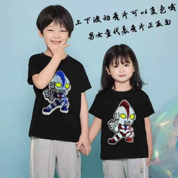 3.5清天猫仓回收4000件纯棉儿童奥特曼亮片变色工艺短袖T恤,码数100-150。...