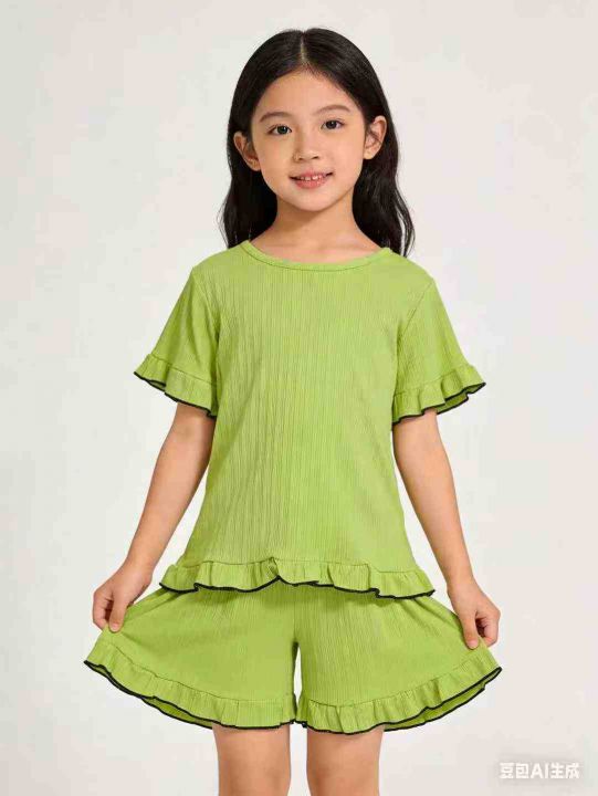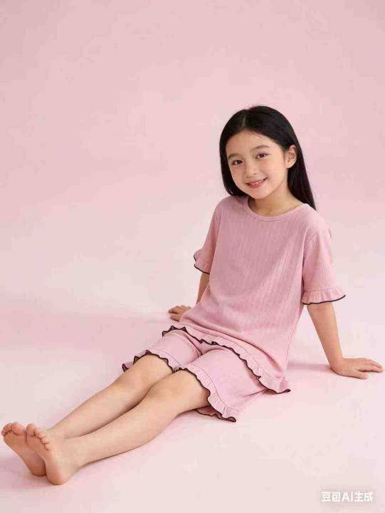 女童纯棉坑条家居服套装舒适花边短袖短裤两件套,数量...