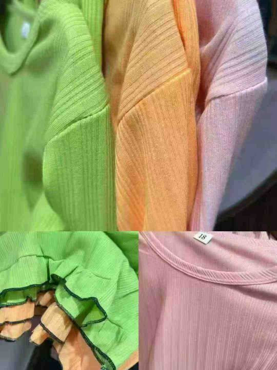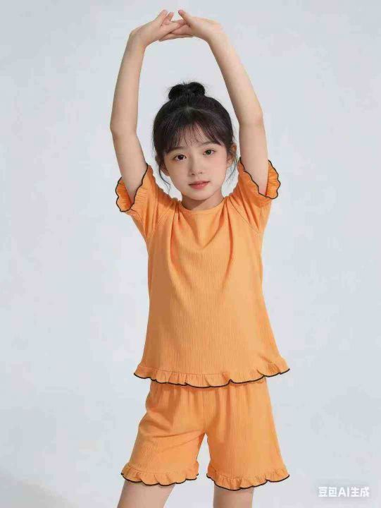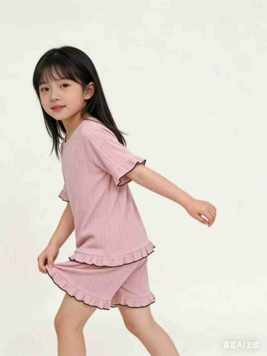 女童纯棉坑条家居服套装舒适花边短袖短裤两件套,数量400套左右,码数10-18(4-12岁穿),独立包装,全清7.9元。 货号:24862