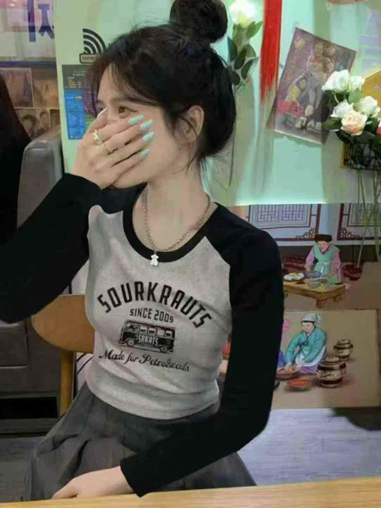 全清价6.5撞色插肩长袖修身显瘦螺纹辣妹T恤,独立包装...