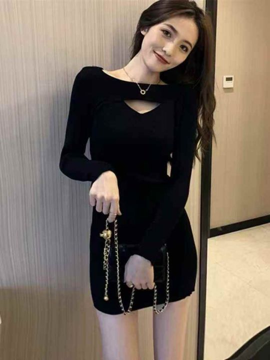 春夏季新款法式复古高弹力修身显瘦半高领坑条开叉设计款针织连衣裙,独立包...