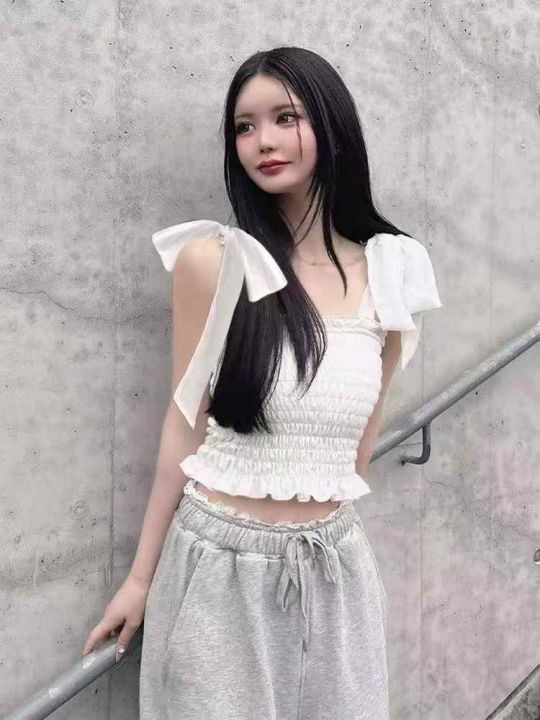 夏季新款纯欲飘带蝴蝶结设计感性感弹力显瘦针织背心,...
