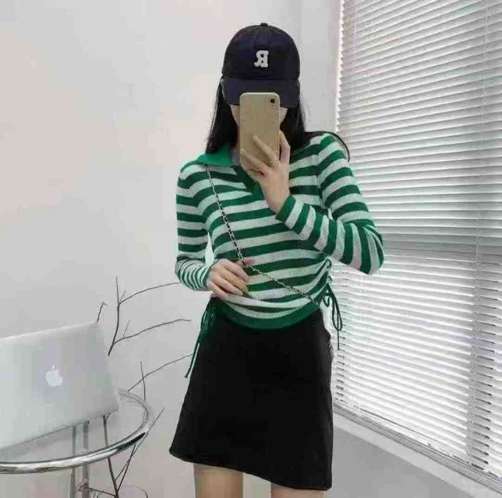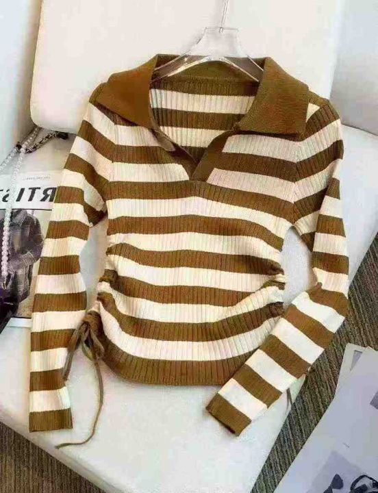 法式高级2025秋装新款韩版翻领条纹抽绳修身打底衫上衣...