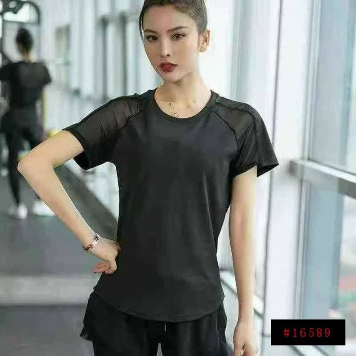 1400件运动健身拼结网纱速干瑜珈短袖。面料柔软舒适,高弹力,品质好。S 一2XL,独立包装带吊牌,全清4.8@_@