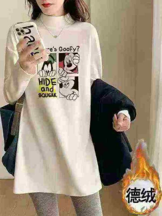 圆领/半高领德绒打底衫女新款内搭宽松白色印花中长款...