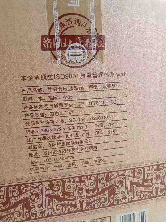 最后54箱杜康老坛淡雅,低价出,100元,一箱起发,一箱6瓶,52度浓香型白酒,这款酒的卖点就是口感,最适合自己喝!河南洛阳杜康总厂生产!。 货号:29195