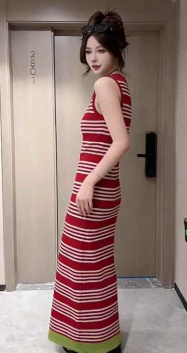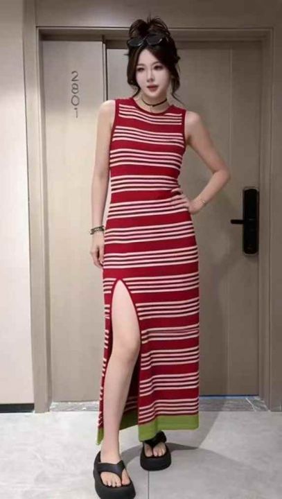 夏季新款撞色条纹韩系冰丝开叉大长款针织背心连衣裙,...