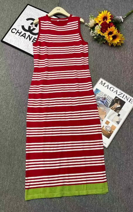 夏季新款撞色条纹韩系冰丝开叉大长款针织背心连衣裙,...