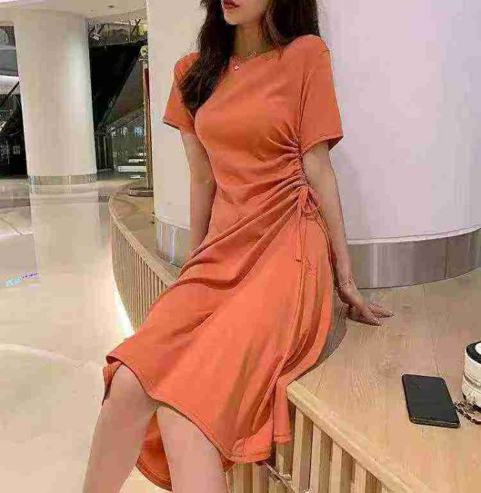 天猫在售款300件左右高品质夏季纯棉中长款靓妹抽绳收腰短袖T恤连衣裙,单款三色,有弹力,码数M-3XL,独立包装
