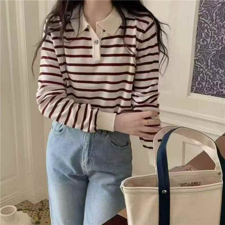 早秋新款韩系宽松高级感撞色条纹百搭POLO领长袖针织毛...