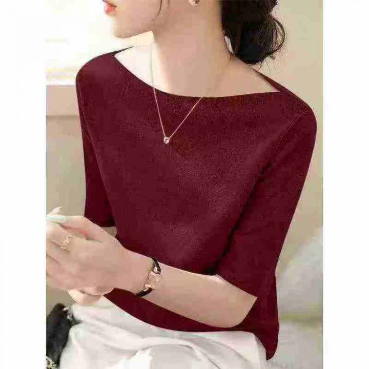 中袖洋气螺纹一字领上衣内搭纯欲风T恤显瘦打底衫,单...