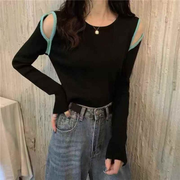 针织撞色镂空修身上衣女秋冬百搭显瘦可外穿内搭毛衣,...