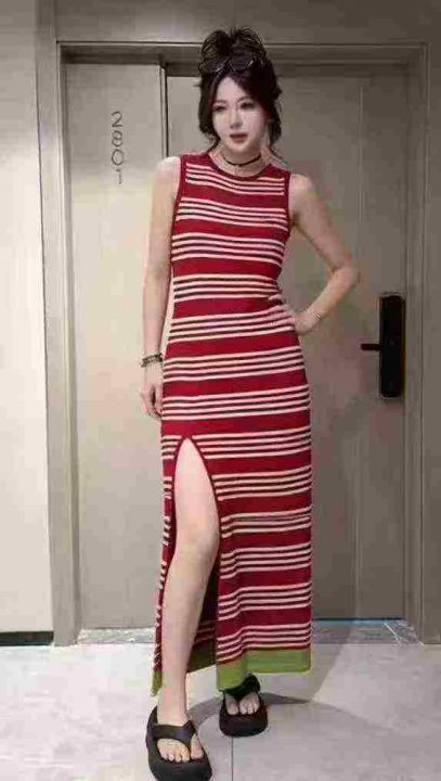 夏季新款撞色条纹韩系冰丝开叉大长款针织背心连衣裙,...