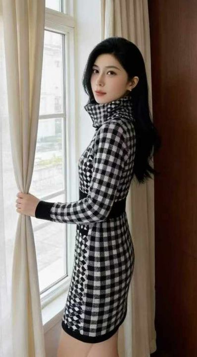 秋冬新款韩系重工烫钻高领千鸟格针织毛衣连衣裙,独立...