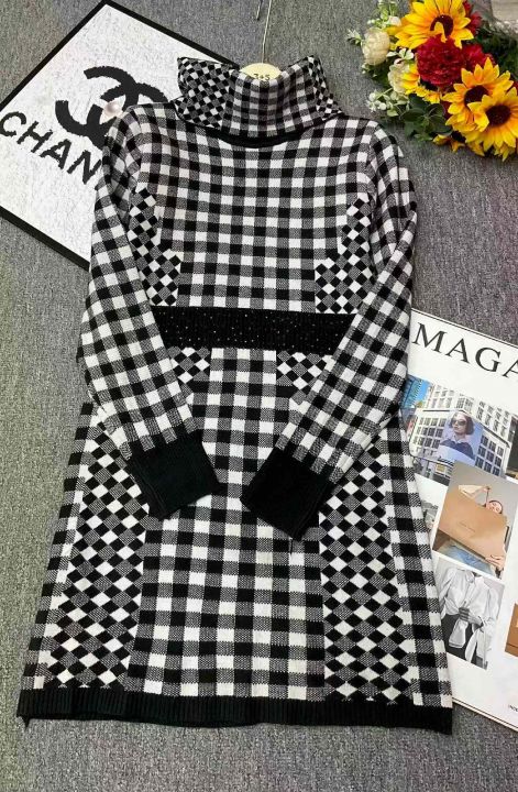 秋冬新款韩系重工烫钻高领千鸟格针织毛衣连衣裙,独立...