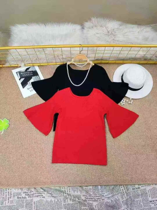 夏款 圆领五分袖短款冰丝针织衫女装时尚套头喇叭袖打底衫上衣,数量110件,单款两色,高弹面料。含70%的纤细羊毛,30%纤维,全部独立包装,均码(可穿120斤以内)低价6.9秒杀
