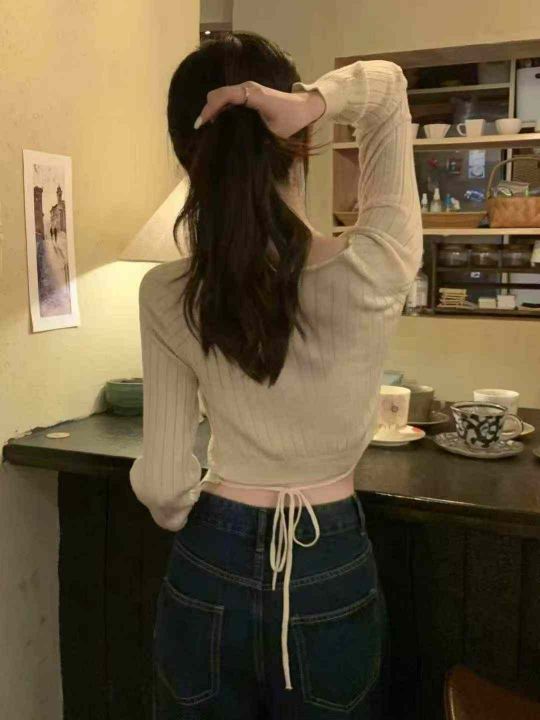 春秋新款法式方领前长后短腰间系带设计感后背露腰短款长袖针织羊毛衫,独立包装,均码面料软糯舒适弹力大,348件,全清5.9元超低价秒杀!分货加一!