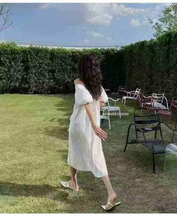 550件天猫在售冷淡风白色仙女裙子茶歇裙一字领露肩性...
