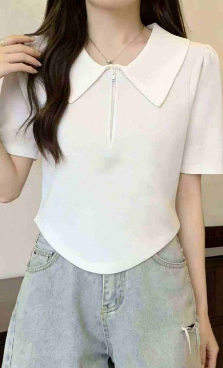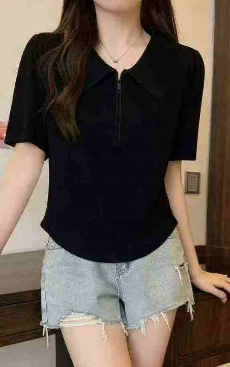 夏季新款韩系正肩POLO领撞色设计感拉链显瘦针织T桖,...