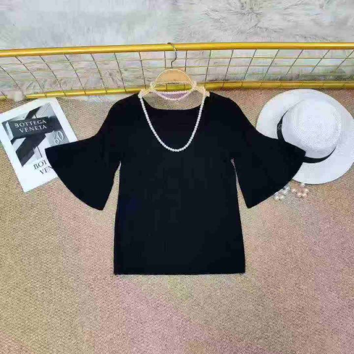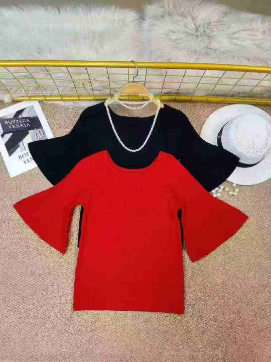 夏款 圆领五分袖短款冰丝针织衫女装时尚套头喇叭袖打底衫上衣,数量110件,单款两色,高弹面料。含70%的纤细羊毛,30%纤维,全部独立包装,均码(可穿120斤以内)低价6.9秒杀