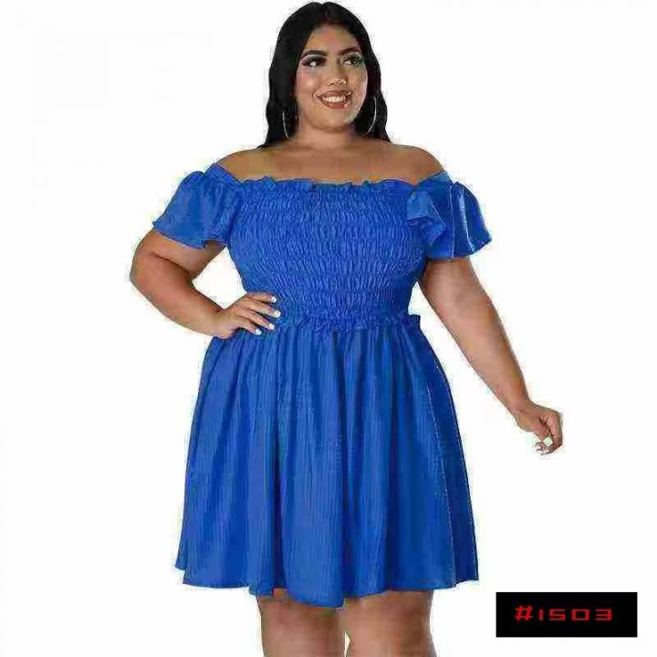 3000件左右,跨境欧美大码夏季女装一字领短袖大摆连衣...