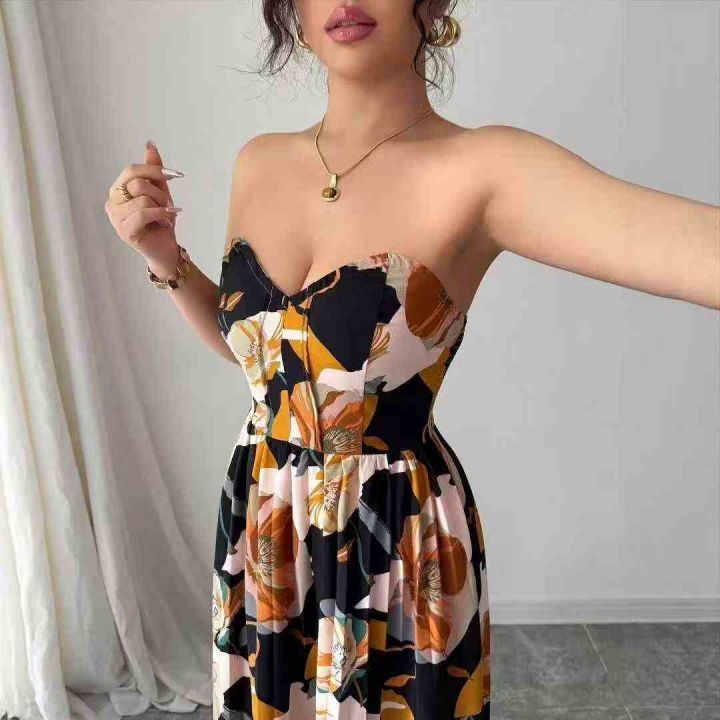 欧美外贸印花压褶无袖抹胸长款甜妹节日连衣裙,独立包...