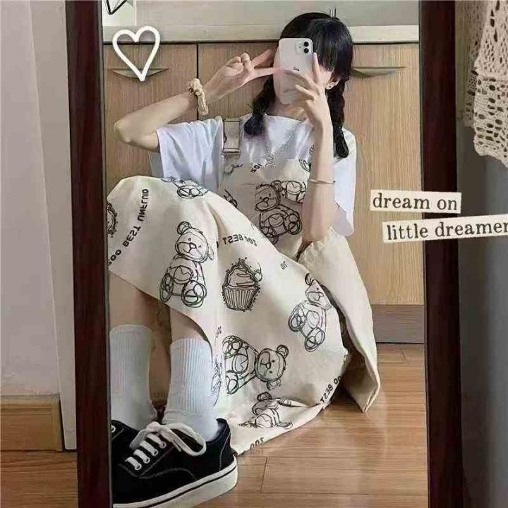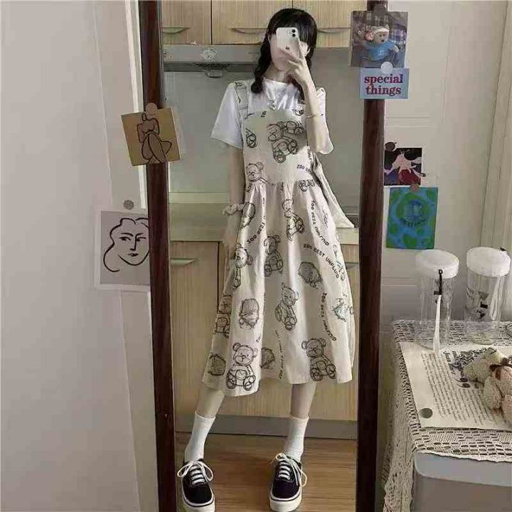 260件左右卡通小熊印花学院风背带连衣裙女中长款宽松...
