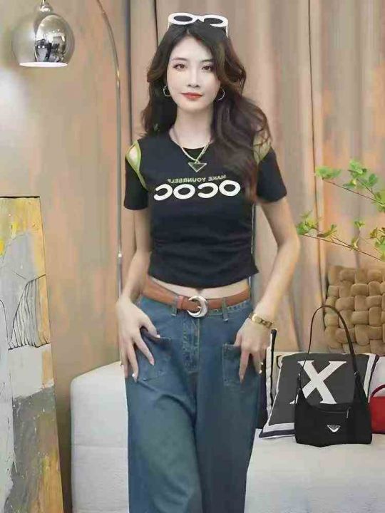 全清价5.9港风时髦露肩短袖t恤显瘦短款字母印花修身辣...