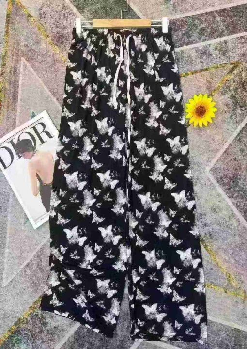 新中式水墨蝴蝶冰丝阔腿裤夏季国风裤女薄款休闲垂感直筒拖地裤子,垂感好,面料柔软舒适,夏天穿它凉感十足[哇],松紧腰不挑人,全部全新独立包装,品质,200件起分货[太阳]9.8