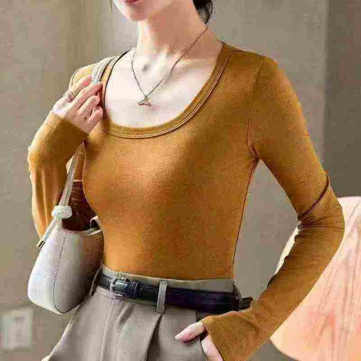 清6.8分货➕0.5纯棉方领内搭打底衫新款女U领长袖t恤春秋冬季百搭修身上衣,...