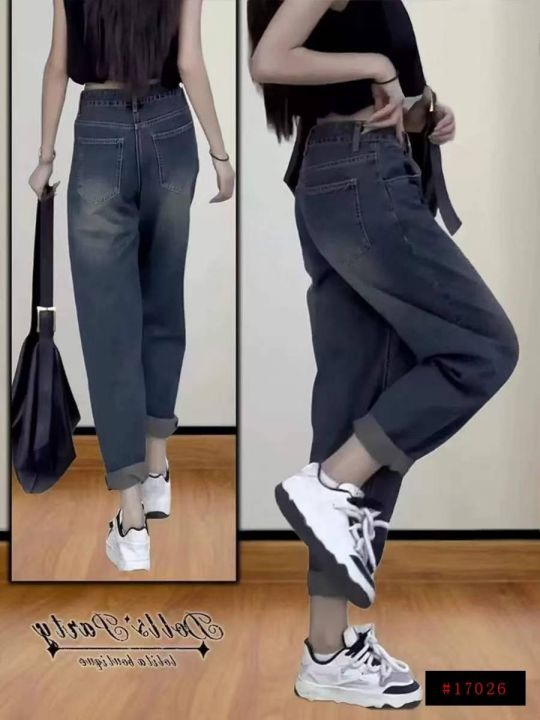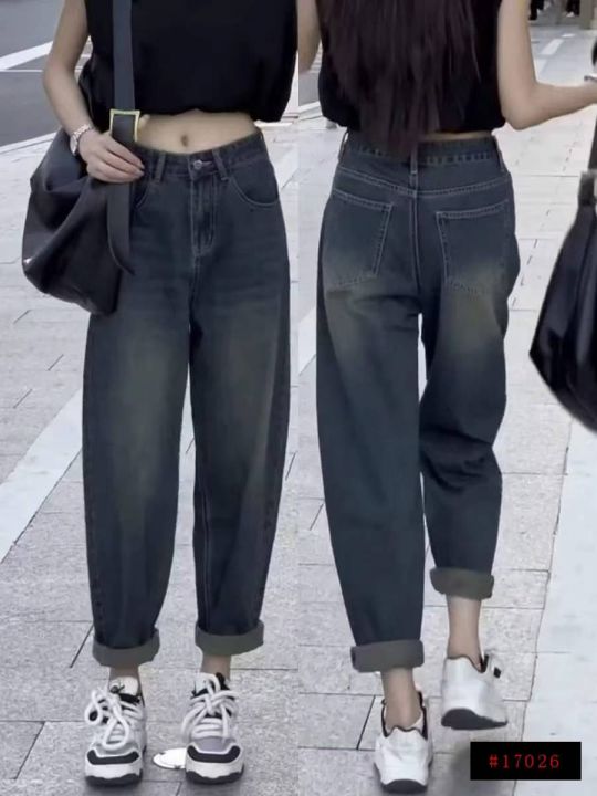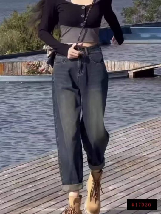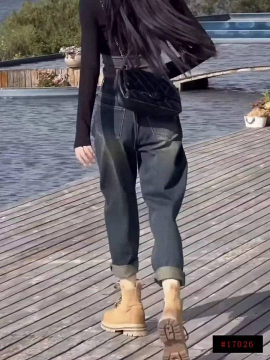 春秋新款高弹力网红复古高腰宽松百搭胖MM哈伦牛仔老爹...