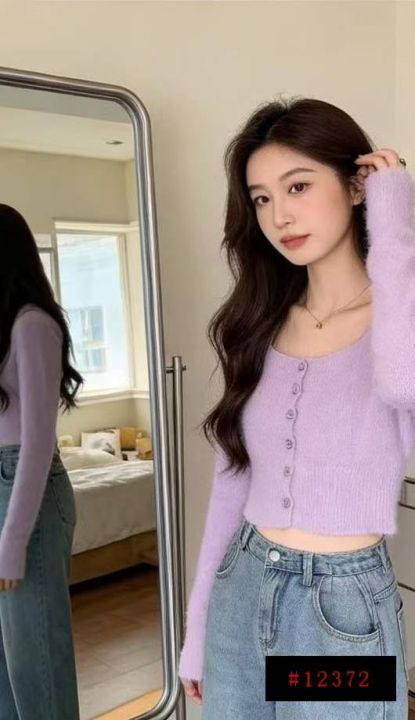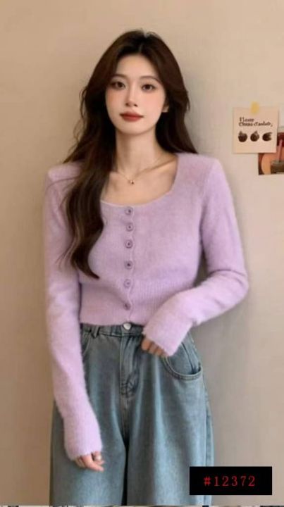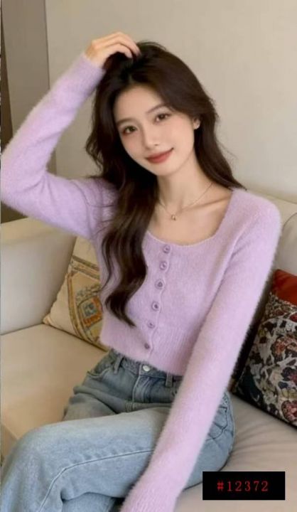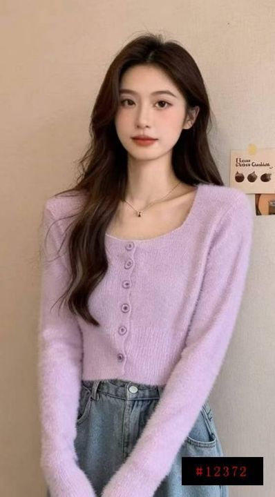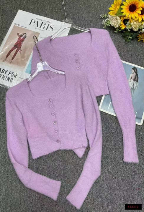 春秋新款法式复古紫色方领高级感弹力修身显瘦水貂毛针织毛衣开衫,独立包装,均码面料软糯舒适,130件,全清7.9元超低价秒杀!@_@