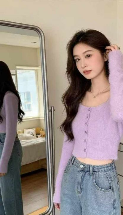 春秋新款法式复古紫色方领高级感弹力修身显瘦水貂毛针织毛衣开衫,独立包装,均码面料软糯舒适,130件,全清7.9元超低价秒杀!