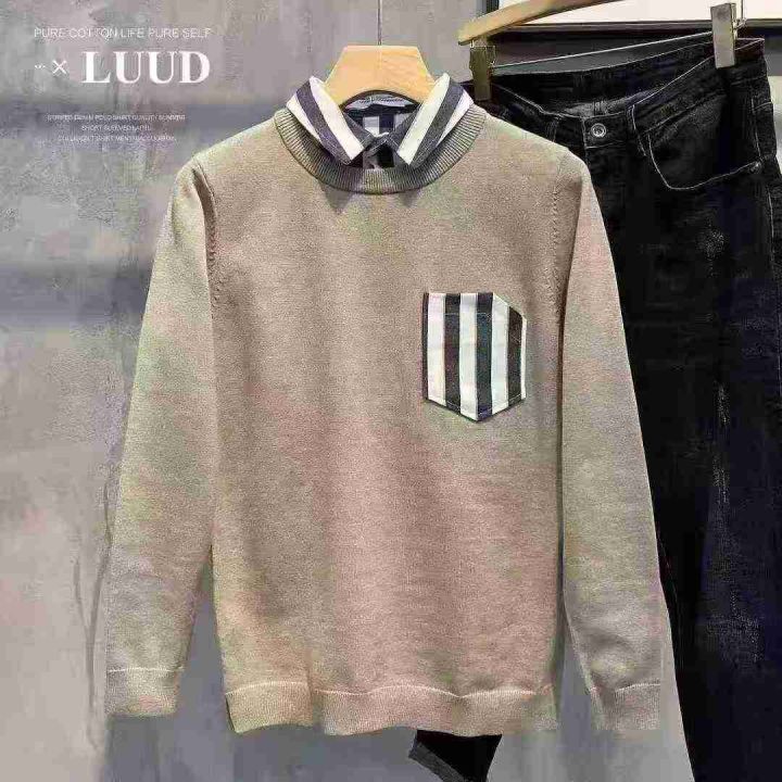 ☕️男士毛衣贴布衬衫领拼接假两件男士休闲复古毛衣英...