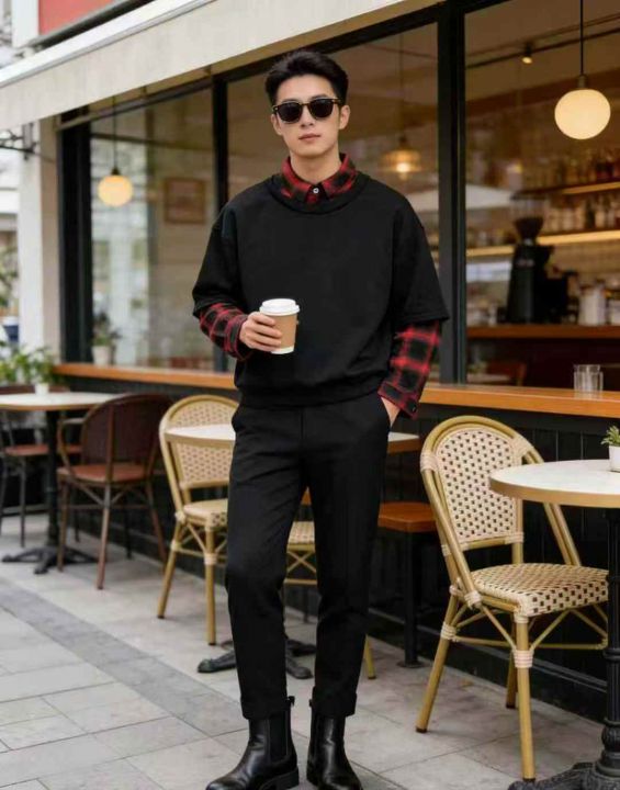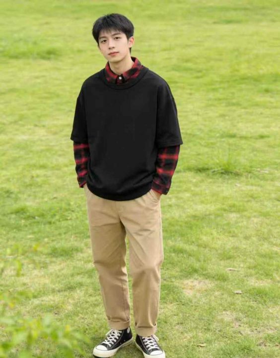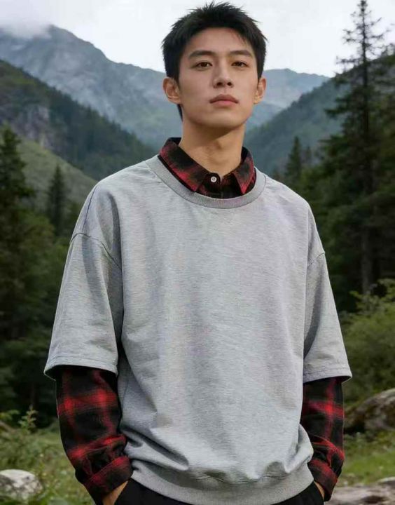 【3400件清仓】潮牌格子假两件长袖T恤▪️ 版型:宽松...