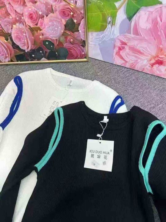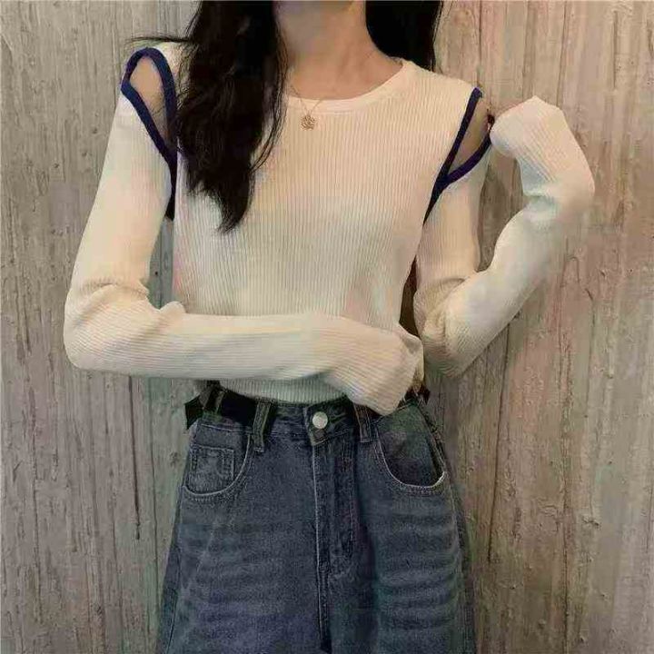 针织撞色镂空修身上衣女秋冬百搭显瘦可外穿内搭毛衣,...