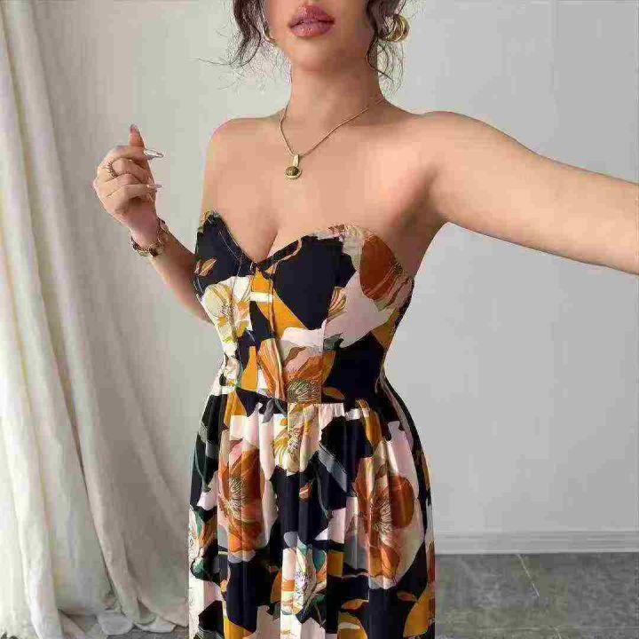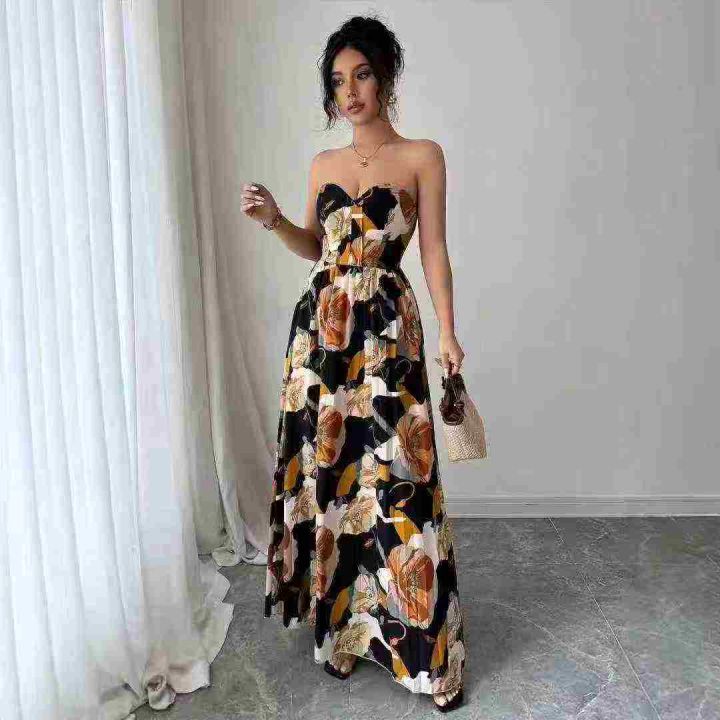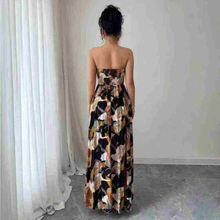 欧美外贸印花压褶无袖抹胸长款甜妹节日连衣裙,独立包...
