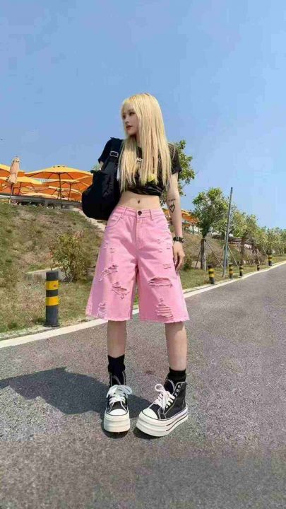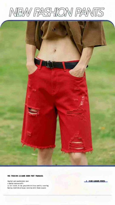 夏季新款洗水棉男女同款宽松破洞美式复古阔腿牛仔短裤...